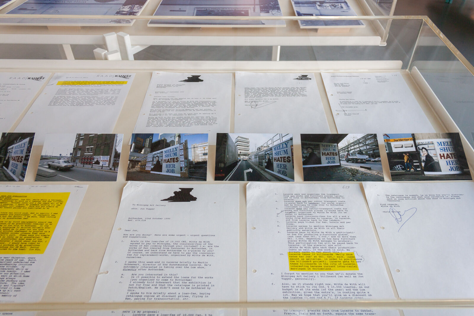 Apart from requesting public funding to finance Ken Lum’s exhibition at Witte de With, the institution required additional funding to finance the billboard project. To realize the latter, Witte de With sold editions of the billboard to museums, galleries, and individuals in the Netherlands and internationally. On the top row you can see one of several funding applications and grant evaluations associated to the exhibition. Also included is correspondence between the neighboring Museum Boijmans, who purchased an edition of “Melly Shum Hates Her Job.”