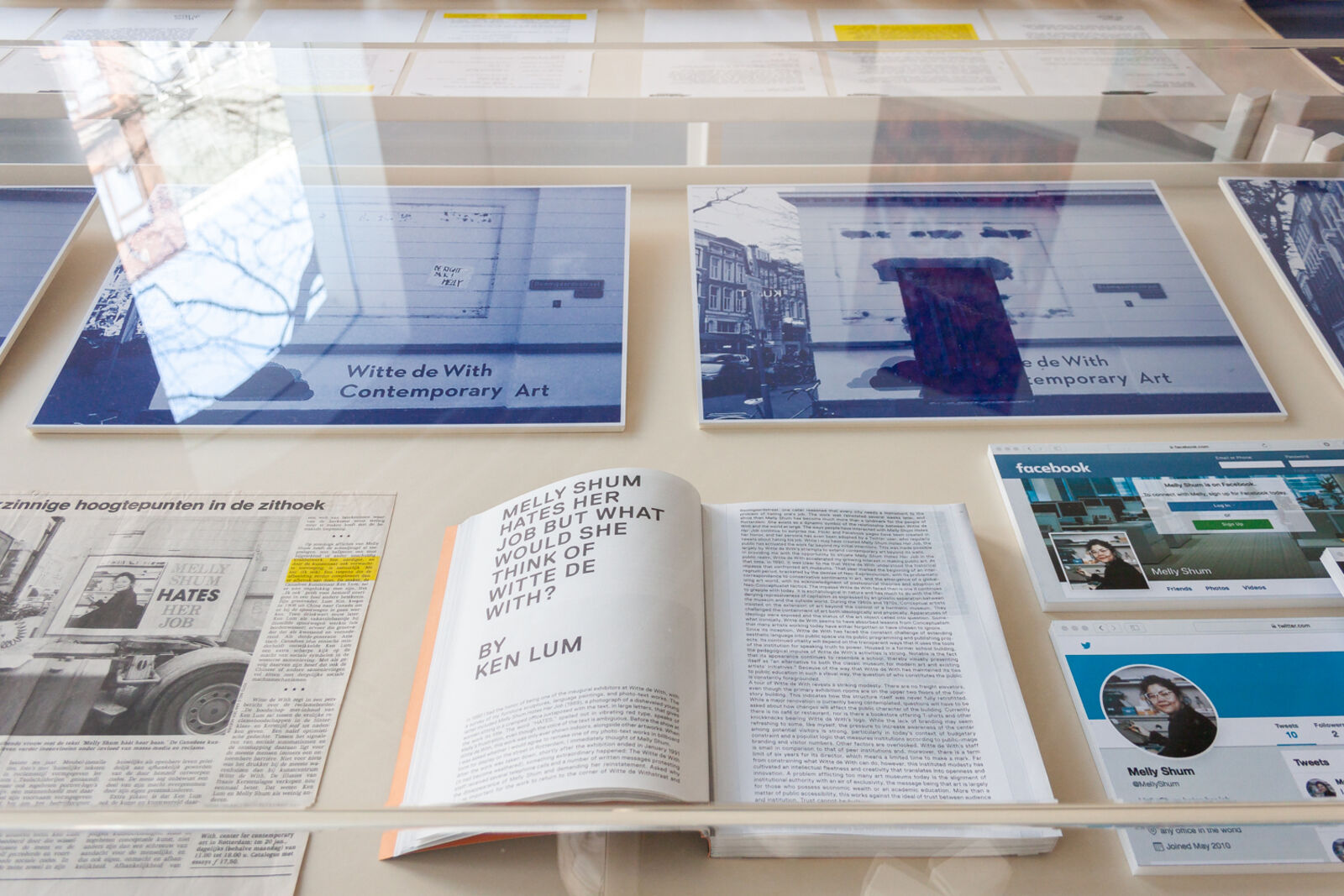 In its very first year of programming, 1990, Witte de With Center for Contemporary Art presented a solo-exhibition of the Canadian artist Ken Lum. This exhibition also included an off-site commission of the artist’s billboard “Melly Shum Hates Her Job.” An image of it wraps around the front and back cover of the accompanying exhibition catalog, presented in this vitrine. Displayed here are documents related to this exhibition and commission. As you may read there, “Melly Shum Hates Her Job” is originally part of a body of work that the artist’s called “Portrait-Logos.” Besides this billboard, a number of works in this series were exhibited within the galleries of Witte de With as part of his exhibition.