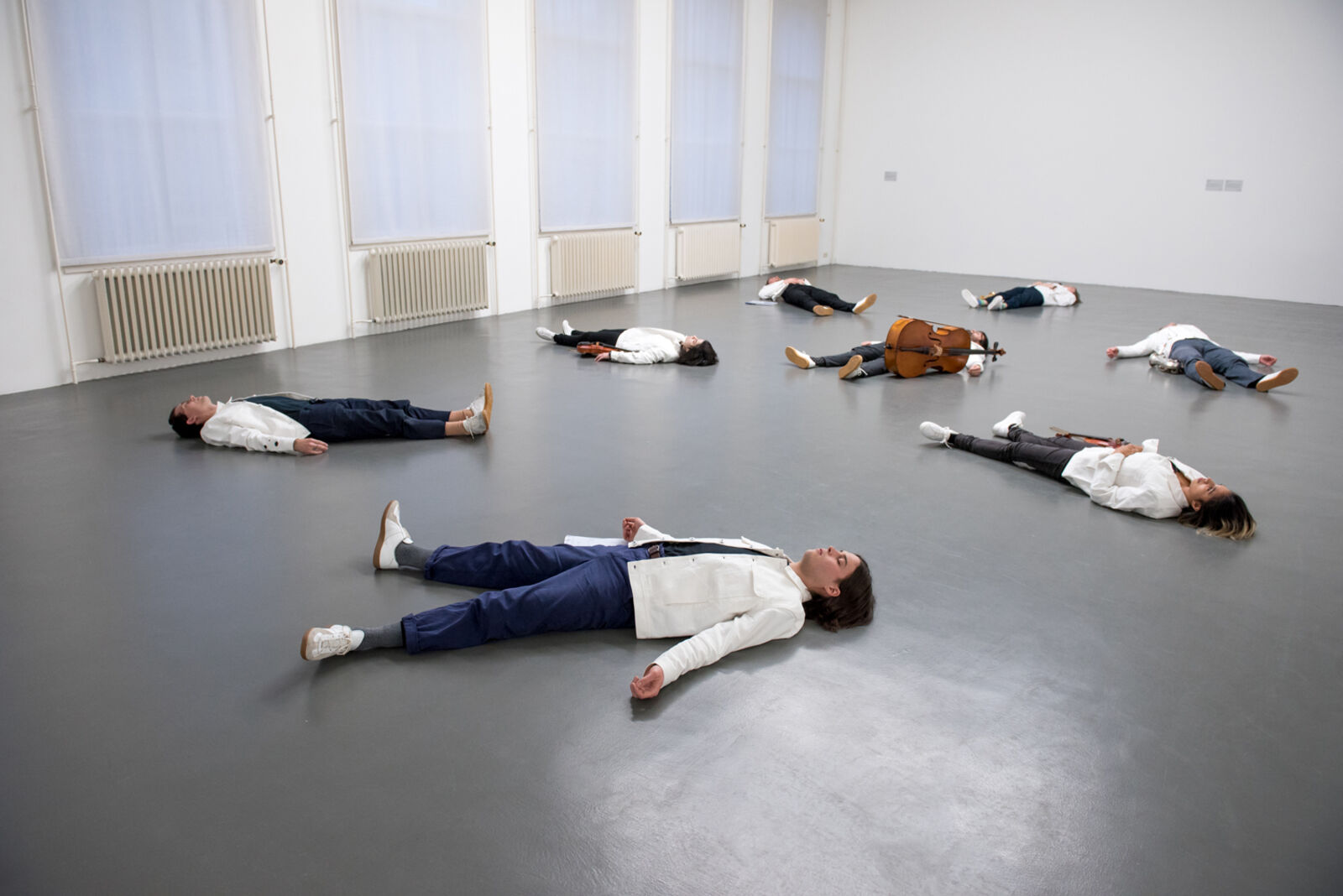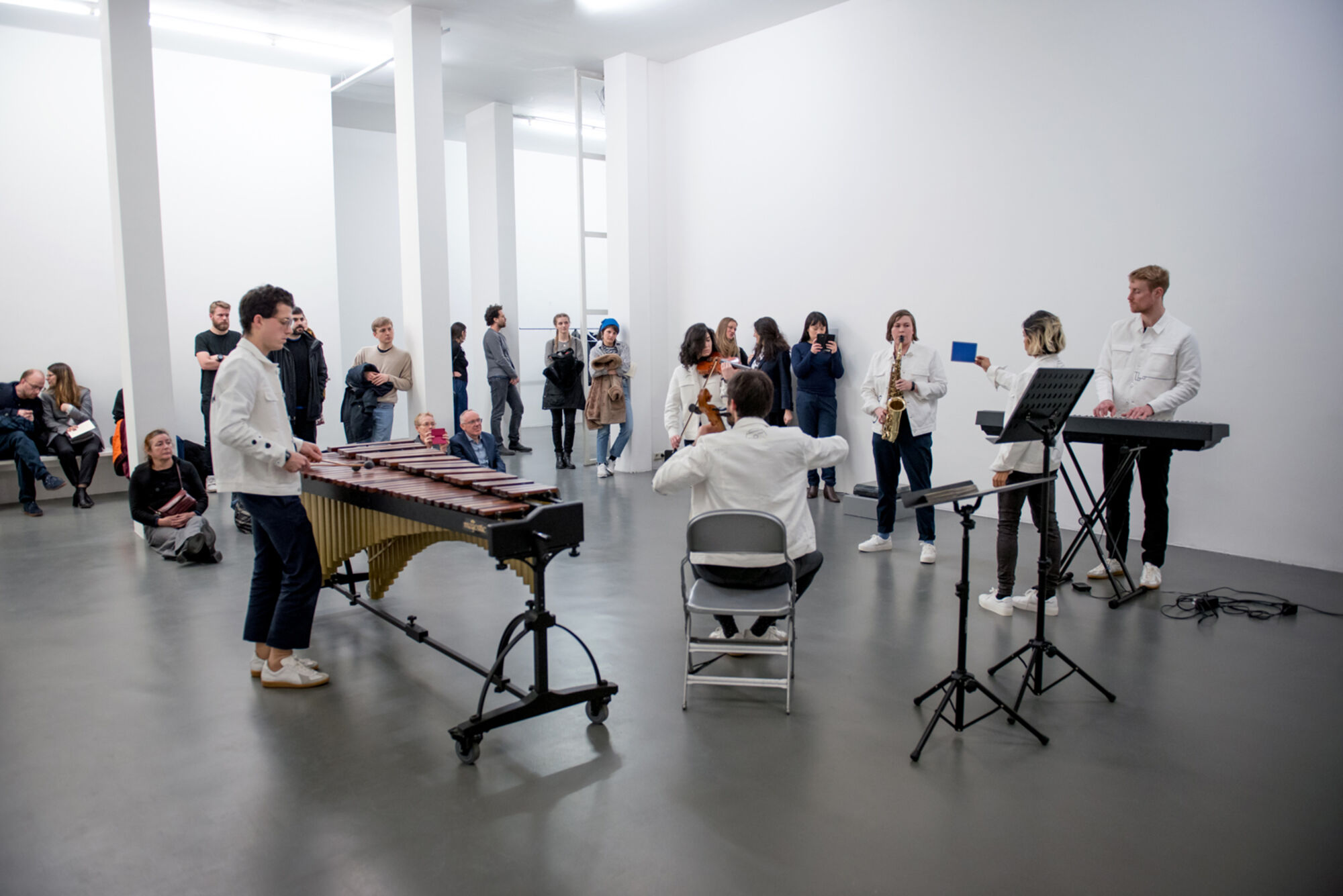 At Kunsthalle for Music, an ensemble performed on-site a four-hour musical score of artworks drawn from a “repertoire” or collection, which included existing and newly commissioned solos, duets, and group pieces. While the artworks included in the score are signaled with wall object-labels throughout the galleries, there is no fixed timetable as to when one or the other will be activated. Composed by Ari Benjamin Meyers, the exhibition score is open to variations, and so offers a unique interpretation and experience every day. We encourage you to visit the Kunsthalle for Music more than once.