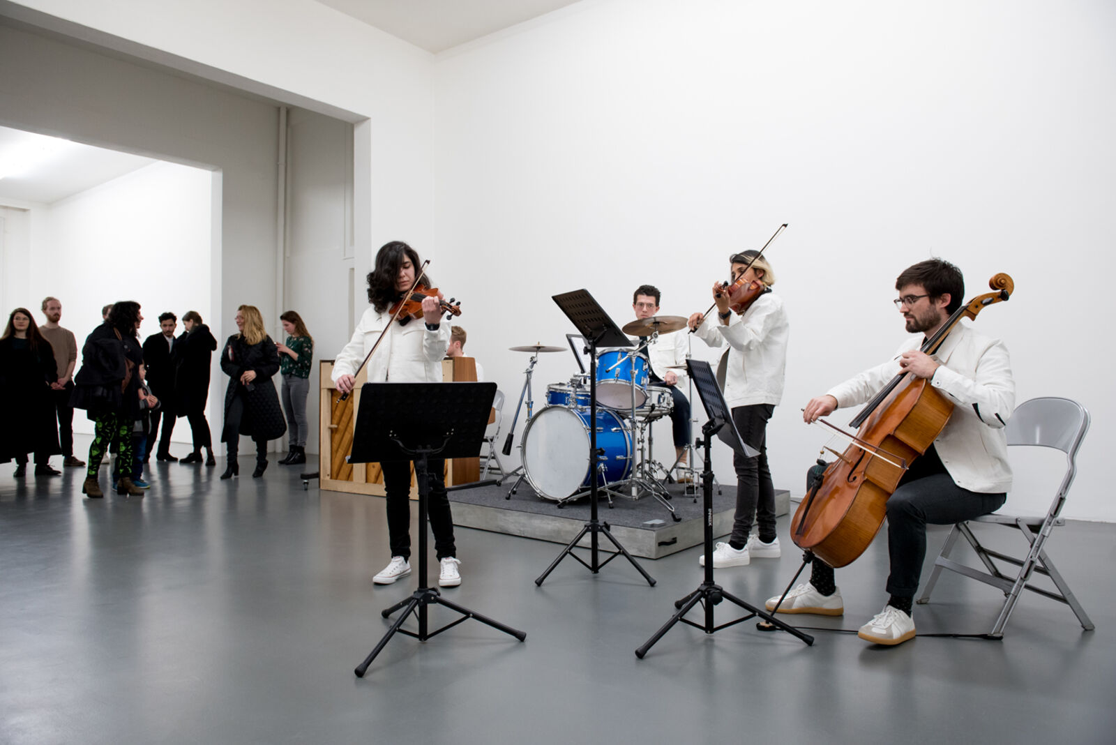 The Kunsthalle for Music ensemble forms the heart of the Kunsthalle for Music, consisting of eight musician-performers. An open-call for musicians of all types, backgrounds and skill-levels resulted in the following ensemble: Bergur Thomas Anderson (guitar), Billy Bultheel (piano), Sandhya Daemgen (violin and voice), Sara Hamadeh (violin), Alexander Iezzi (drums and percussion), Nanna Ikonen (saxophone and electronics), Jackson Moore (saxophone), and Pau Marquès i Oleo (cello).