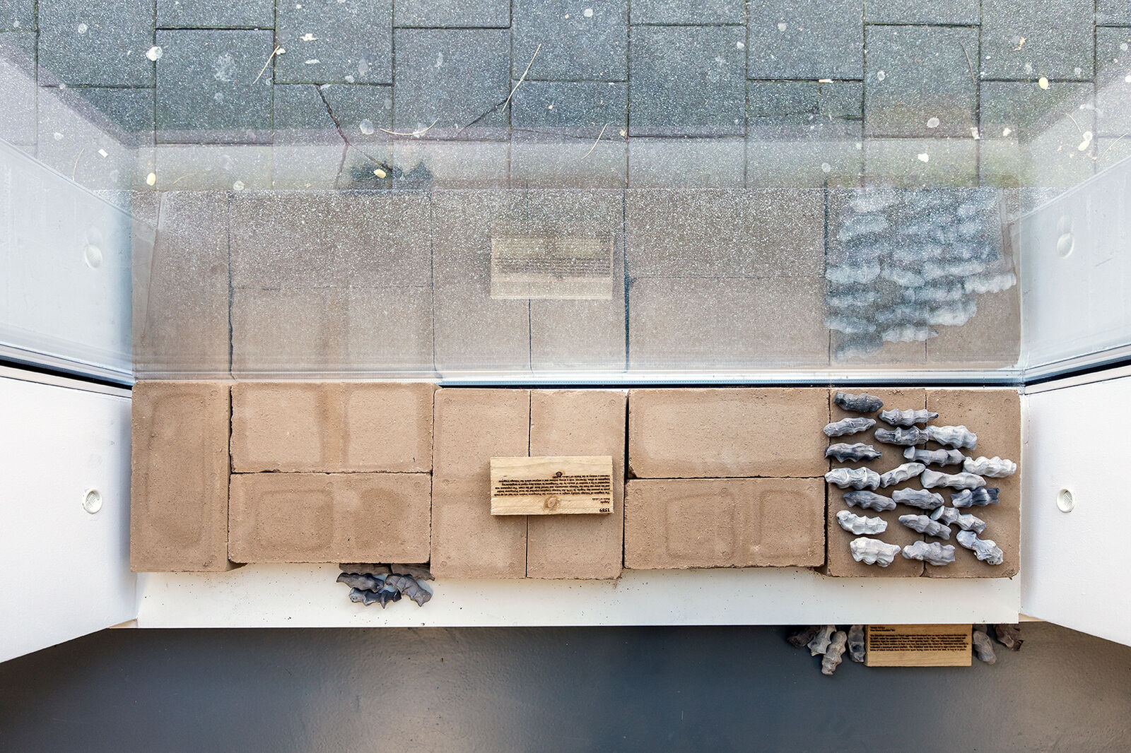 The work is an ephemeral monument, a gesture made in commemoration of those acts and beings. It is comprised of bricks, gold leaf, and a sound composition comprised of collected recordings of a resplendent quetzal bird, mythologically known as the bird that commits suicide when held in captivity. The calls of the quetzal are mixed with sounds of the bodies of water that surround the African continent, as well as those that snake through its mass.