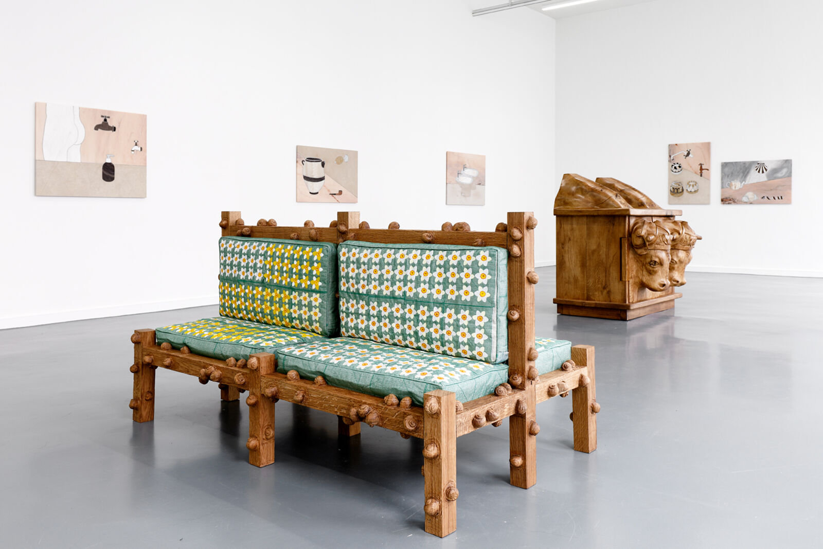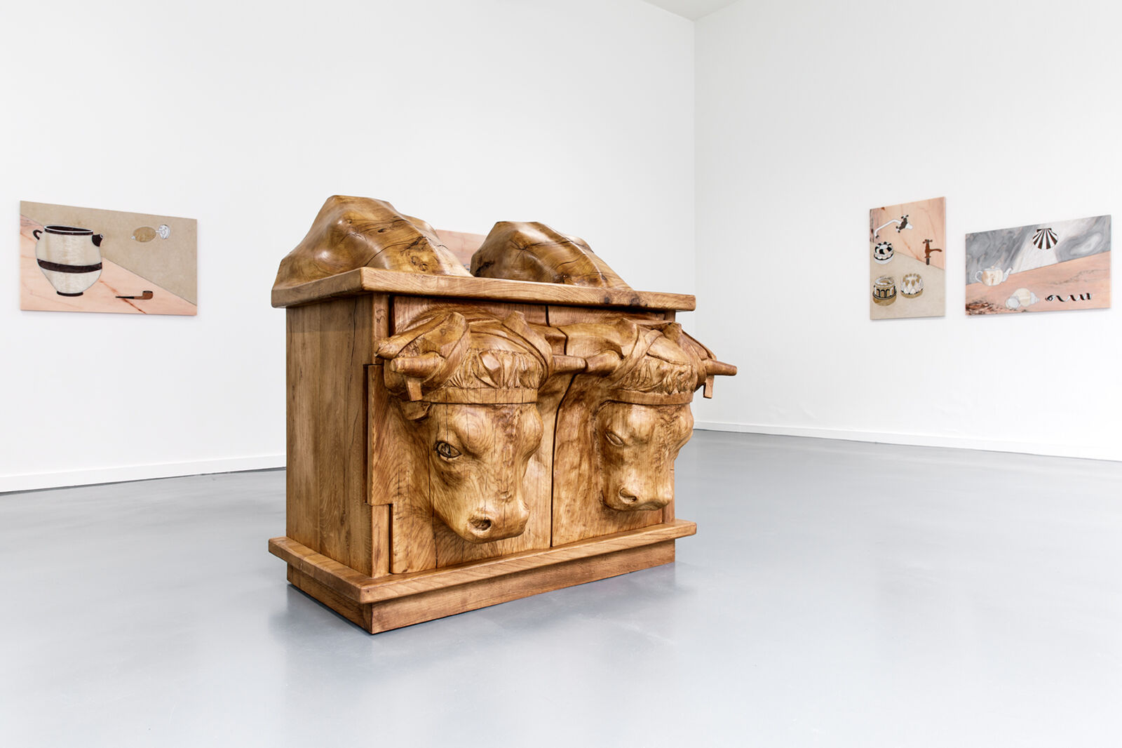 Emphasizing the dialogic in creation and critique – a process inherent to the artist duo’s own sculptural practice – the text could be read as a manifesto of the pair’s sculptural process. Much like the architecture Valéry’s protagonists speak of is mirrored in the architecture of the text itself –a poiesis at work, a building that operates through thinking, speaking, and writing–, Dewar and Gicquel’s sculptures and murals embody their own making, oscillating between perfection and imperfection. The surrealist André Breton is known to have mockingly altered Valéry’s texts by replacing a given word by its opposite, revealing the supposed equivocal nature of the poet’s writing. For THE NUDE AND THE SAP, Dewar and Gicquel have undertaken a similar irreverent approach, replacing the word architecture with sculpture. The artists continuously dissect and reconstruct the medium of sculpture through their iconoclastic practice. With great wit and a bold visual language they traverse the aesthetic registers of sixteenth century pastoral and "brutalist rustic", to create a series of sculptures that explore the tensions and interrelations between nature and culture, material and form, animal and human.