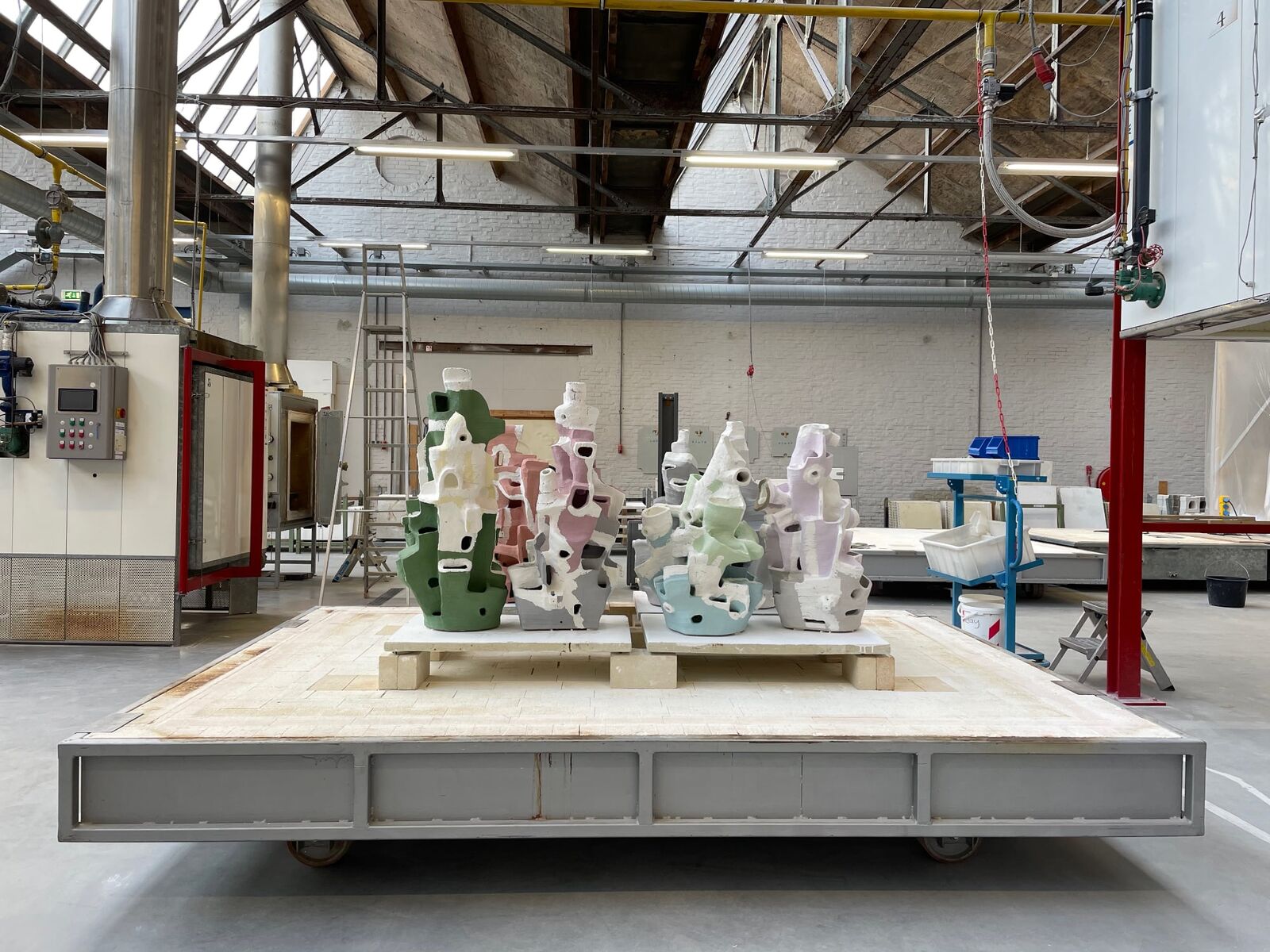 During this musical performance within 84 STEPS, Mangano van Rooy and the musicians interact with the sculptures, touching and scratching them to create sounds, and handling the sculptures’ orifices as air instruments. This special collaboration between the artist duo and composer Kate Moore originated at the European Ceramic Work Center in Oisterwijk, where Moore worked on a new project at the time that Mangano van Rooy realized Dilution Cafeteria.