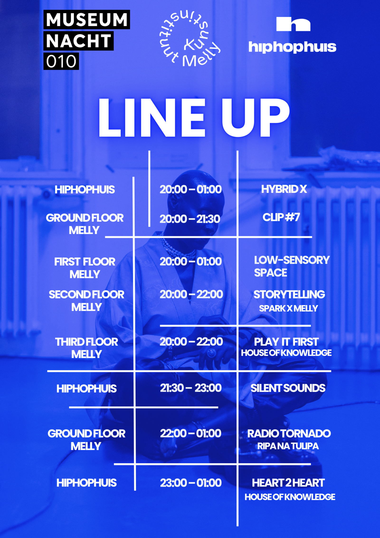Join us at Kunstinstituut Melly for Museumnacht010, an evening of play, music, and exhibitions that bring the entire building to life. In collaboration with House of Knowledge, SPARK, and Radio Tornado, we present a participatory program where live improvisations interact with Melly’s current exhibitions.