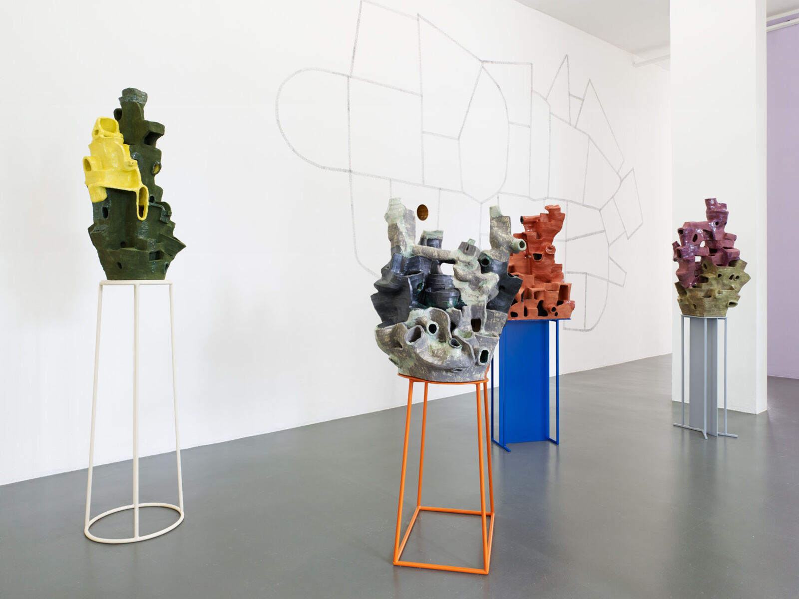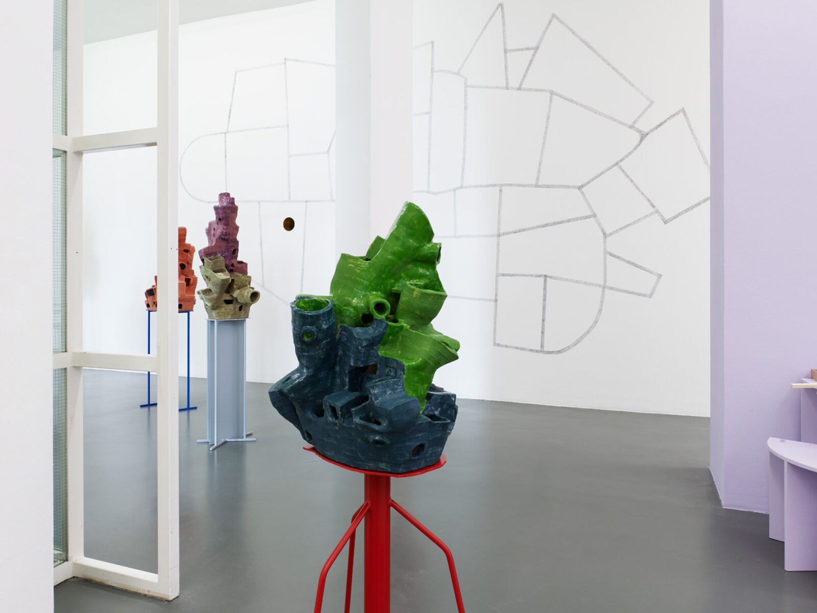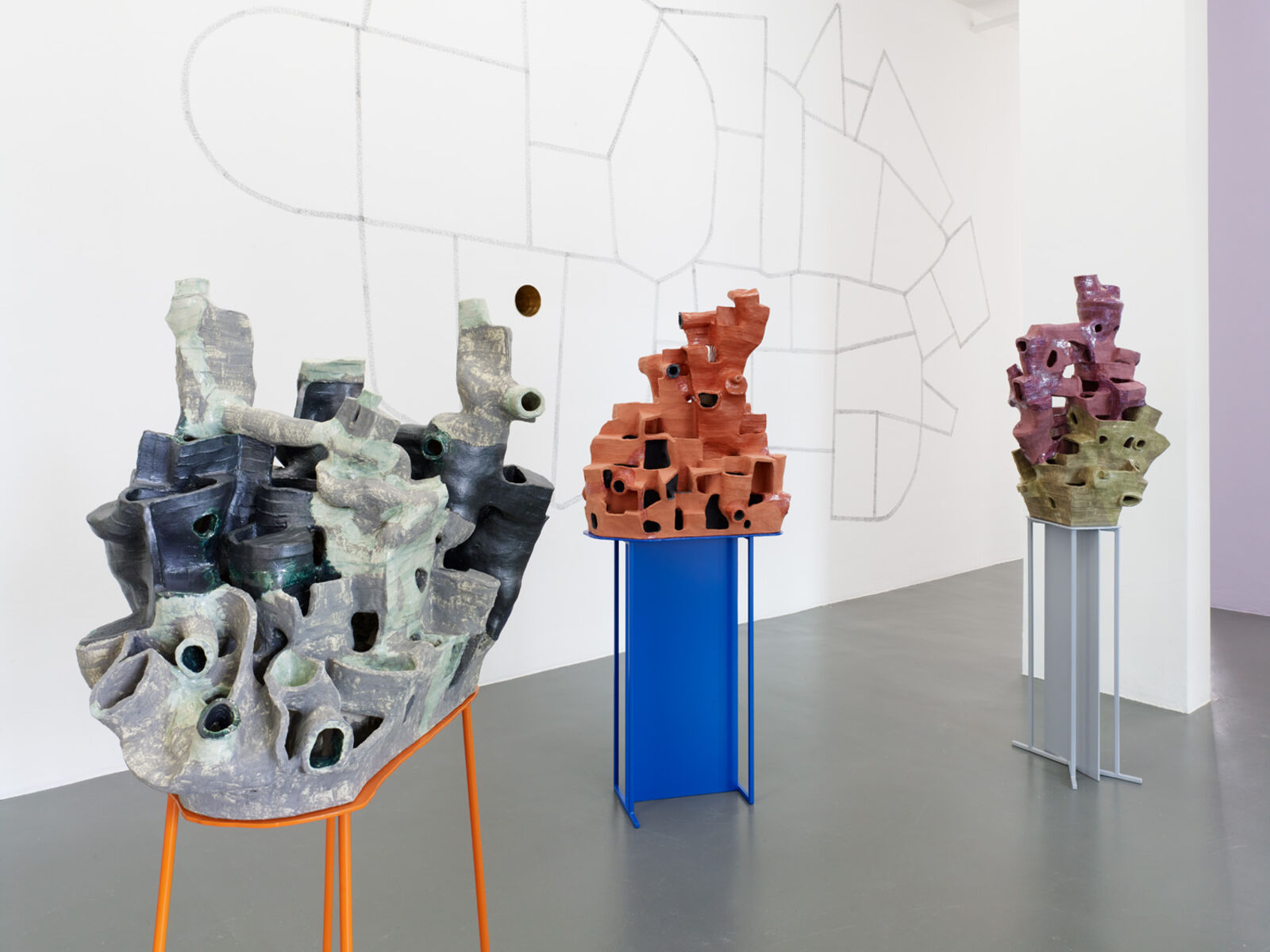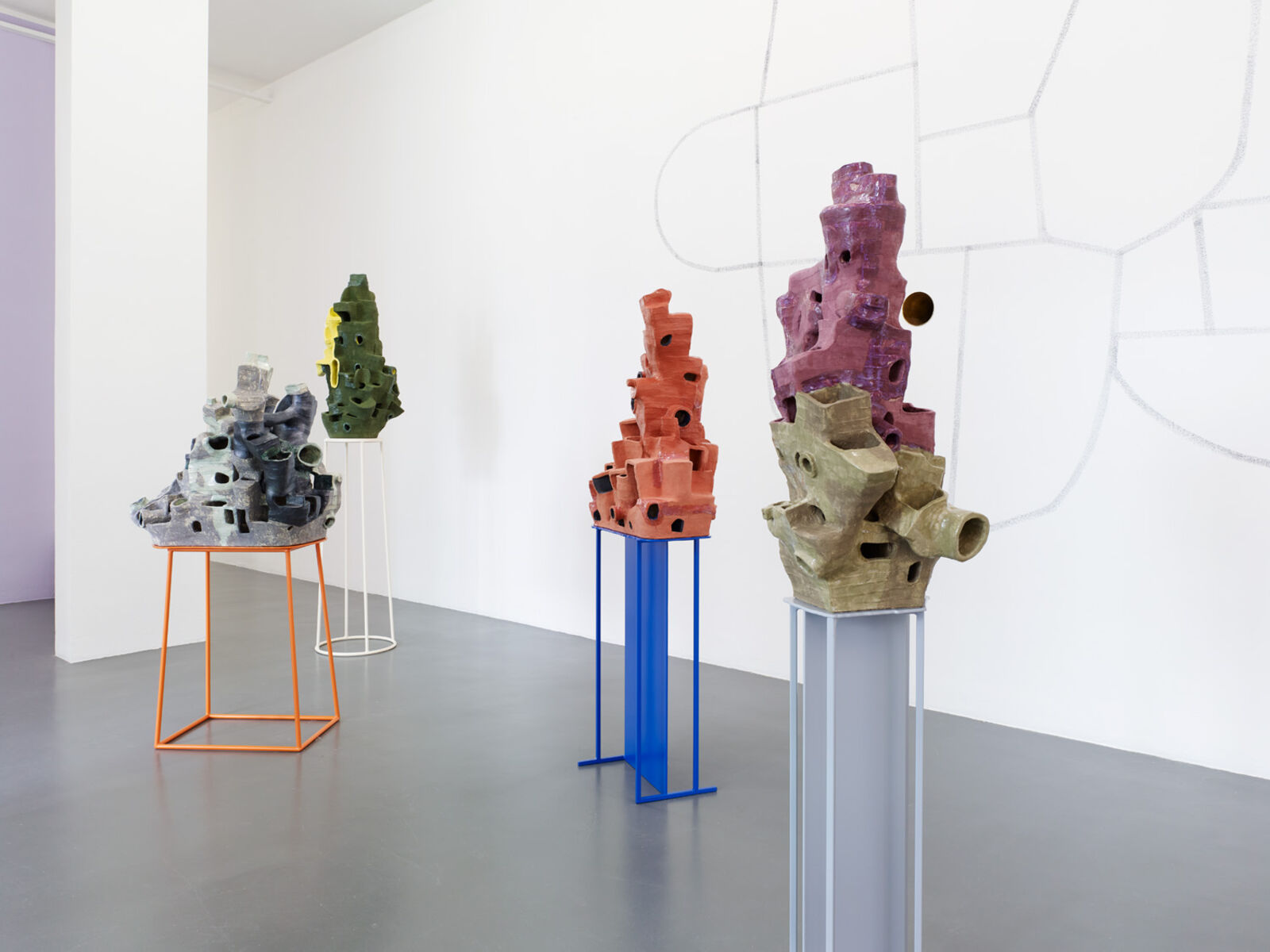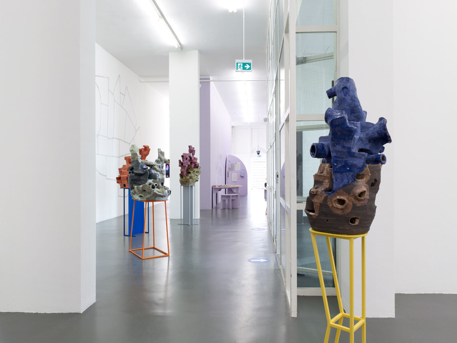 Mangano van Rooy is vanuit dit concept geinteresseerd in de manier waarop kennis en ervaring worden gesocialiseerd via de zintuigen. De installatie bestaat uit zes sculpturen van geglazuurde keramiek en een muurschildering van houtskool waarin een megafoon is verwerkt. De installatie presenteert complexe innerlijke labyrinten, die de kunstenaars 'mentale architecturen' noemen. Met variaties in kleur, vorm en structuur fungeren de sculpturen als een soort intermediairs, ze markeren de mogelijkheden en de grenzen van de zintuiglijke waarneming. In de loop van dit jaar zal de installatie worden geactiveerd als 'sensorisch cafetaria', met speciale nadruk op geluid en tastzin. Raadpleeg onze website voor meer informatie over de op activiteiten gebaseerde programmering.