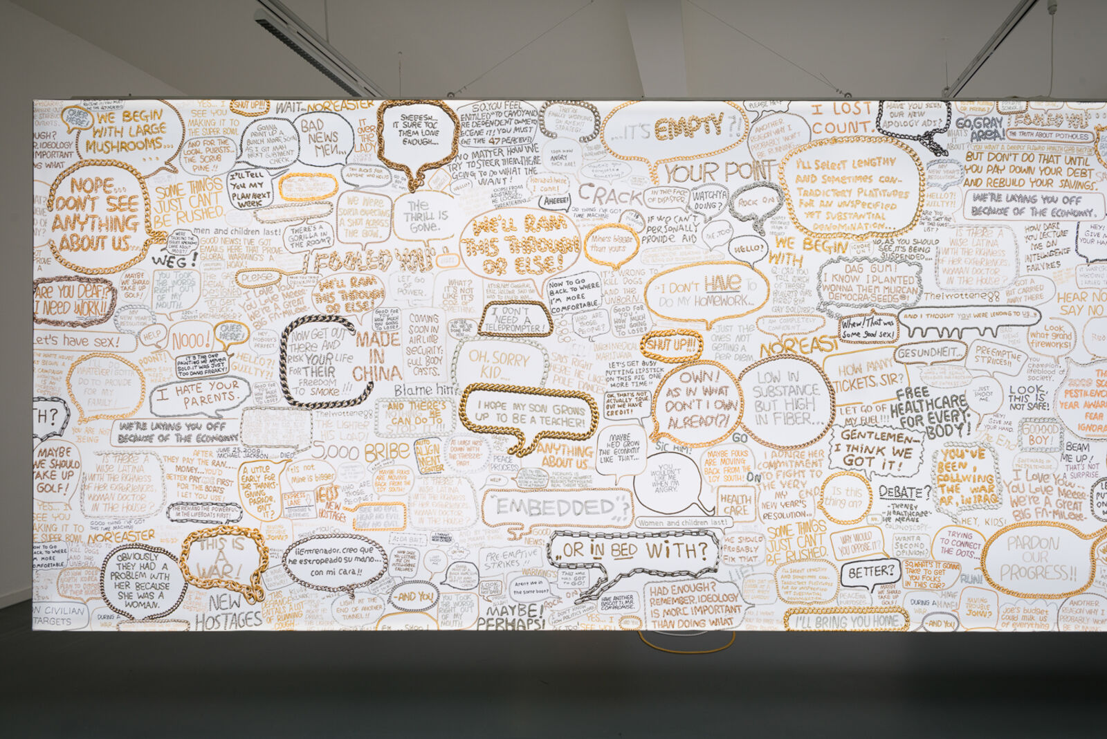 Op de grond creëren de metalen ketens titels en logo’s uit Witte de Withs voorbije programma in de vorm van sculpturen. Glimmend als juwelen maar ook wegend op de fundamenten van het instituut: de keuze voor de aaneengeregen schakels belichaamt de ambiguïteit van de geschiedenis die tegelijk een schat en een last is. De afbeeldingen te zien in de lichtbak zijn ontleend aan de Metal Language serie waarin zinnen van politieke karikaturen te lezen zijn. De “bling” van de kettingen en het veelvuldig gebruik van uitroeptekens verwijzen naar graffiti-muurschilderingen, waarin individuele slogans opgaan in een groter geheel.