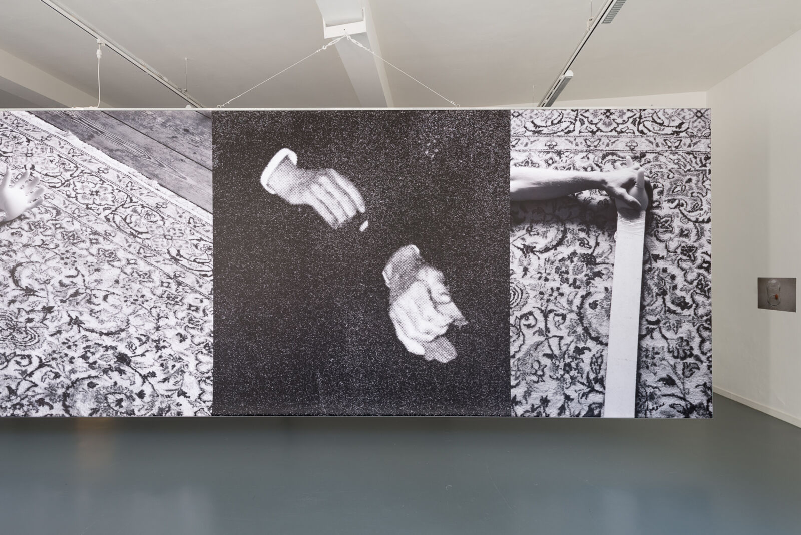 De lichtbak zweeft in de ruimte, groot als een muur, licht als een kader. Even ambigue als dit presentatiemiddel zijn de afbeeldingen die erop getoond worden: menselijke en artificiële handen in verstilde bewegingen, manipulaties van verschillende objecten. Het doel van deze gestes blijft ongekend.