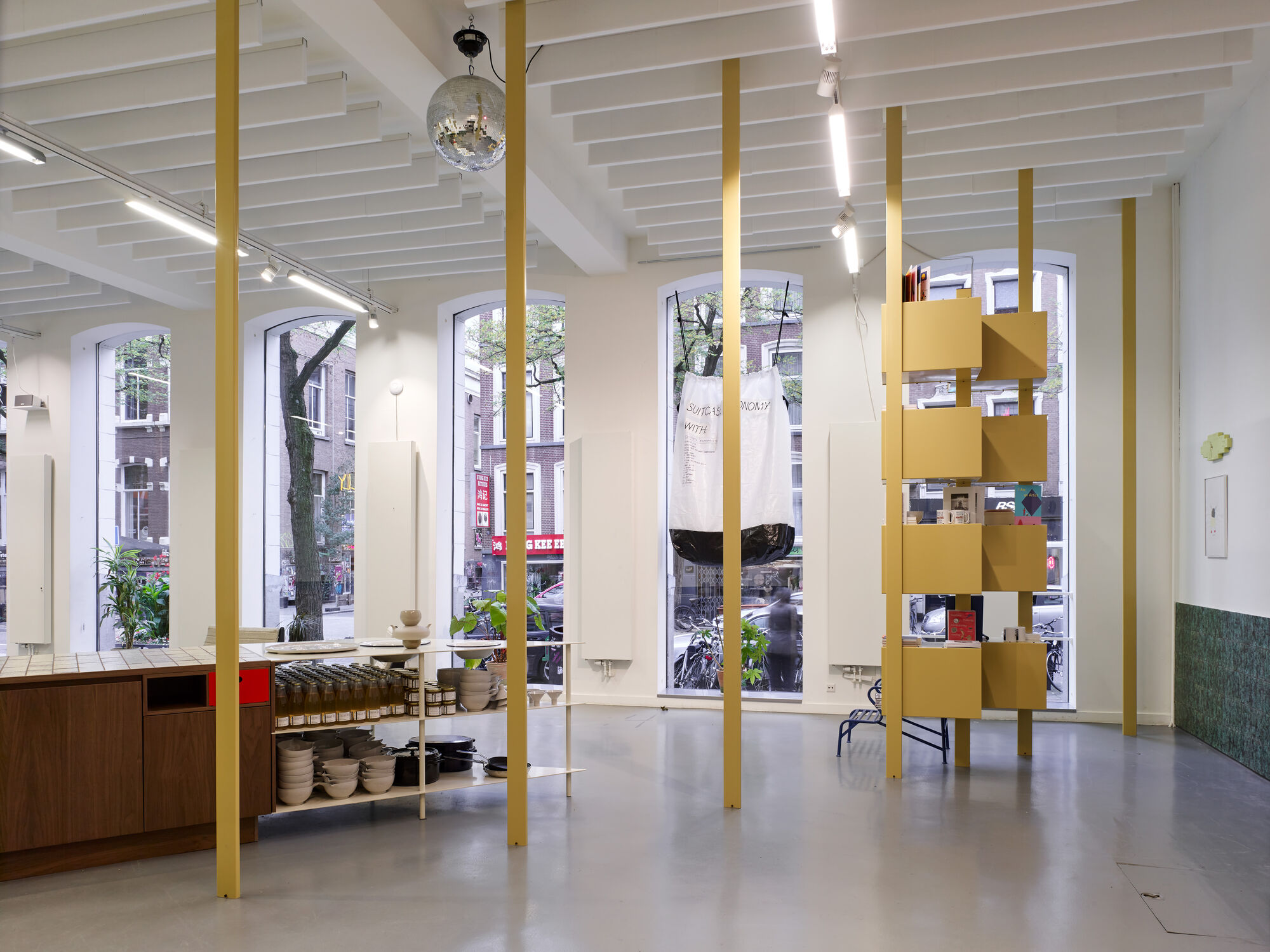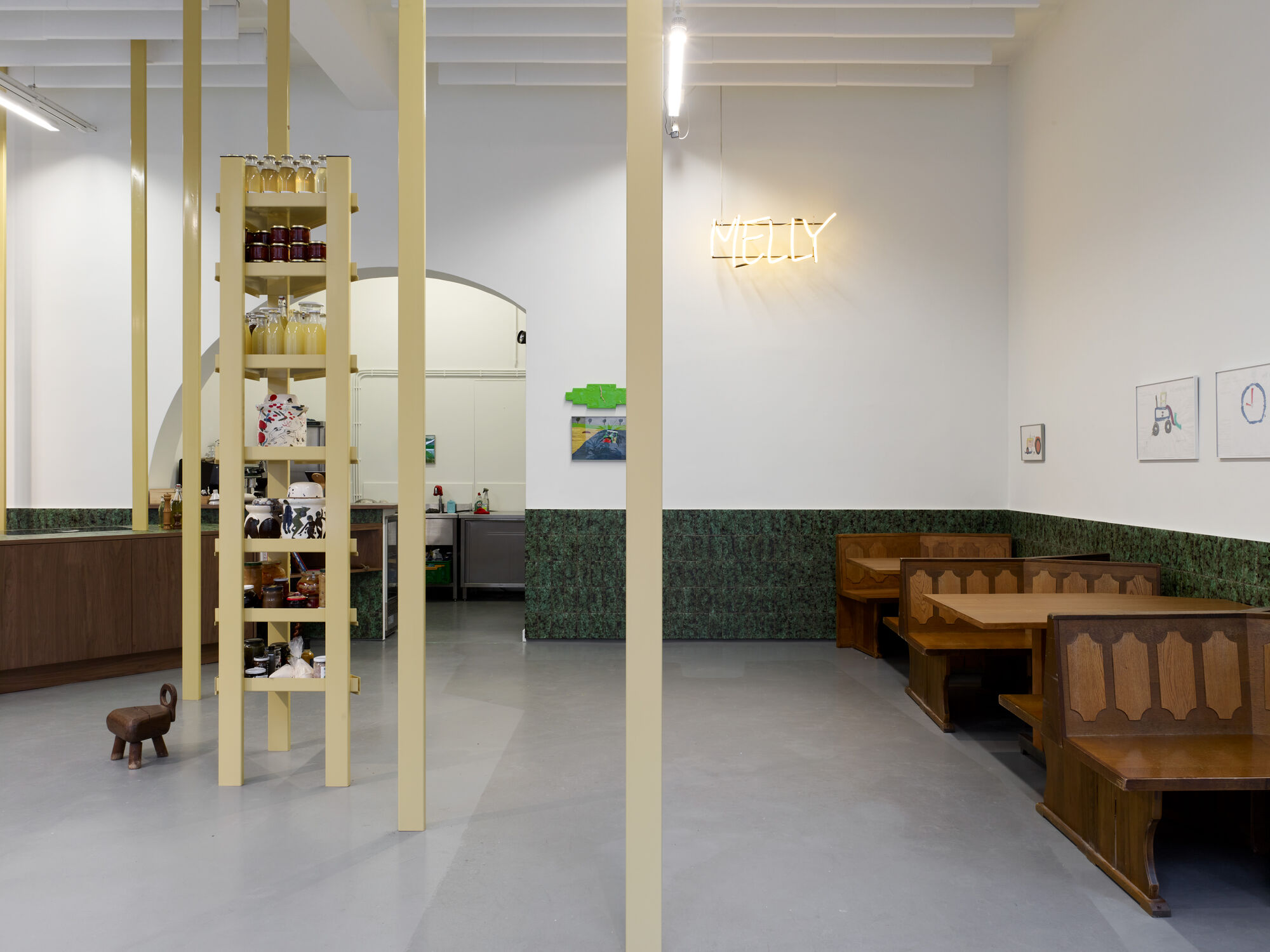 Een gele driehoekige structuur verdeelt de kantine in zestien lijnen. De structuur komt voort uit Riet’s langlopende project Sixteen Conversations on Abstraction, hierin onderzoekt zij over het hoofd geziene en voor sommige nog onbekende geschiedenissen van abstractie. In deze serie staat geel voor locatie en groen voor tijd.