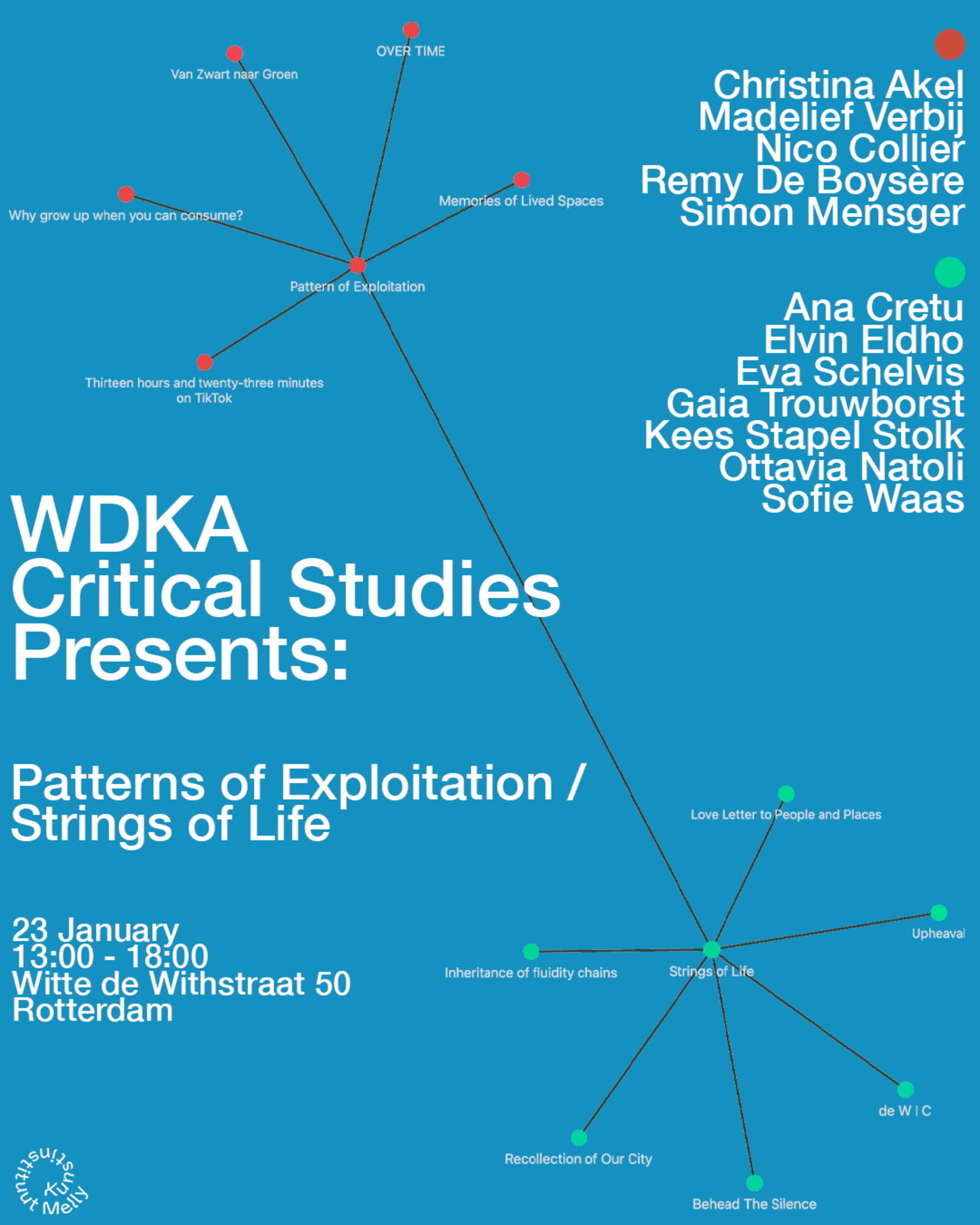 Kom op donderdag 23 januari naar de groepstentoonstelling Strings of Life/Patterns of Exploitation van twaalf studenten van de Willem de Kooning Academie! Geïnspireerd door werk en werkwijze van Cihad Caner en Nolan Oswald Dennis, wiens stukken momenteel te zien zijn in Kunstinstituut Melly, verdiepen zij zich in onderwerpen als verhalen vertellen, herinnering, cultureel erfgoed of cycli van uitbuiting. De toegang is gratis!