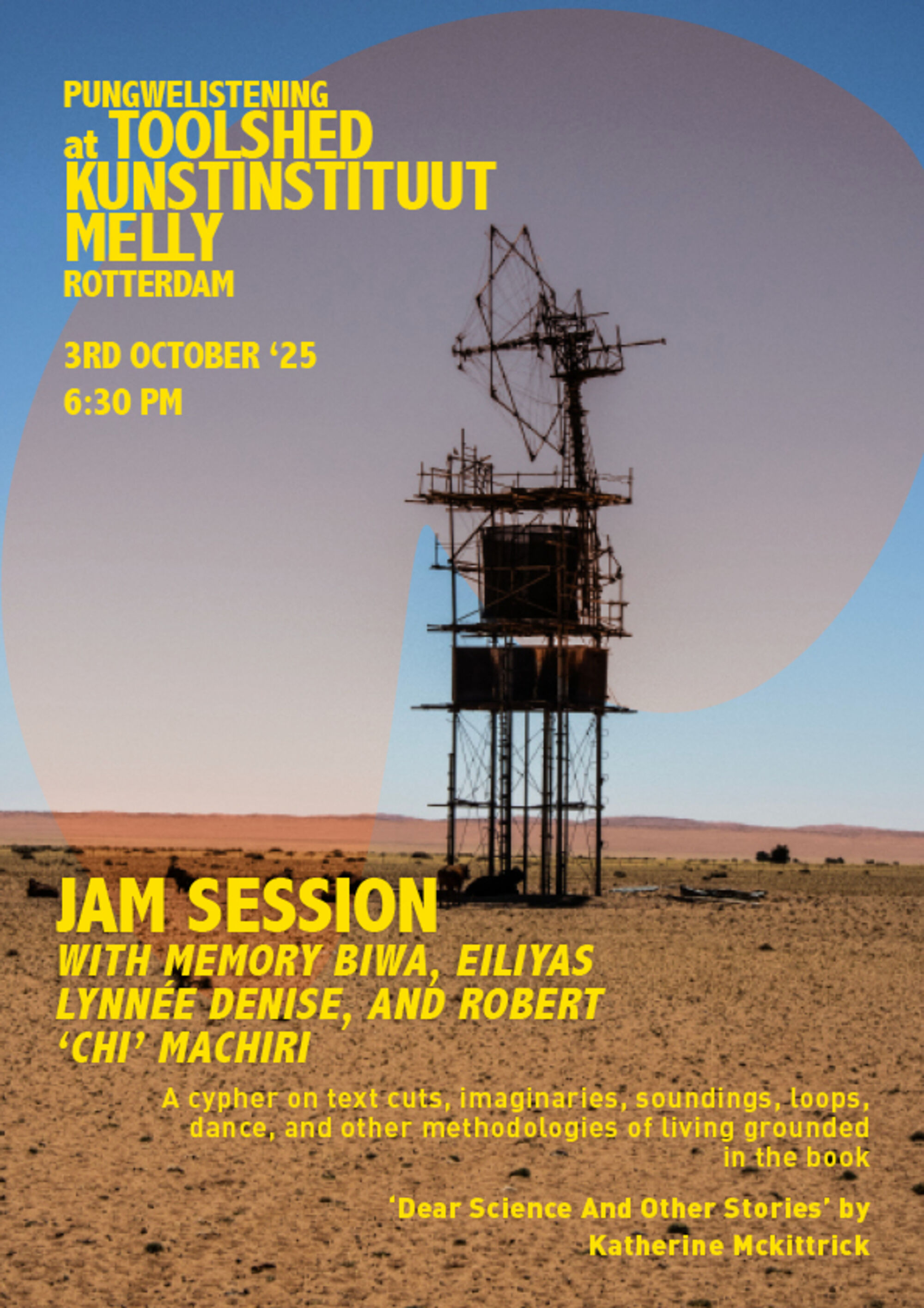 Kom naar een Pungwe Listening Jam: een sessie van reststukken, gesneden en gemixte fragmenten, drie-in-één specials, overblijfselen en meeneemgerechten, geïnspireerd door Dear Science and Other Stories van Katherine McKittrick (Duke University Press).