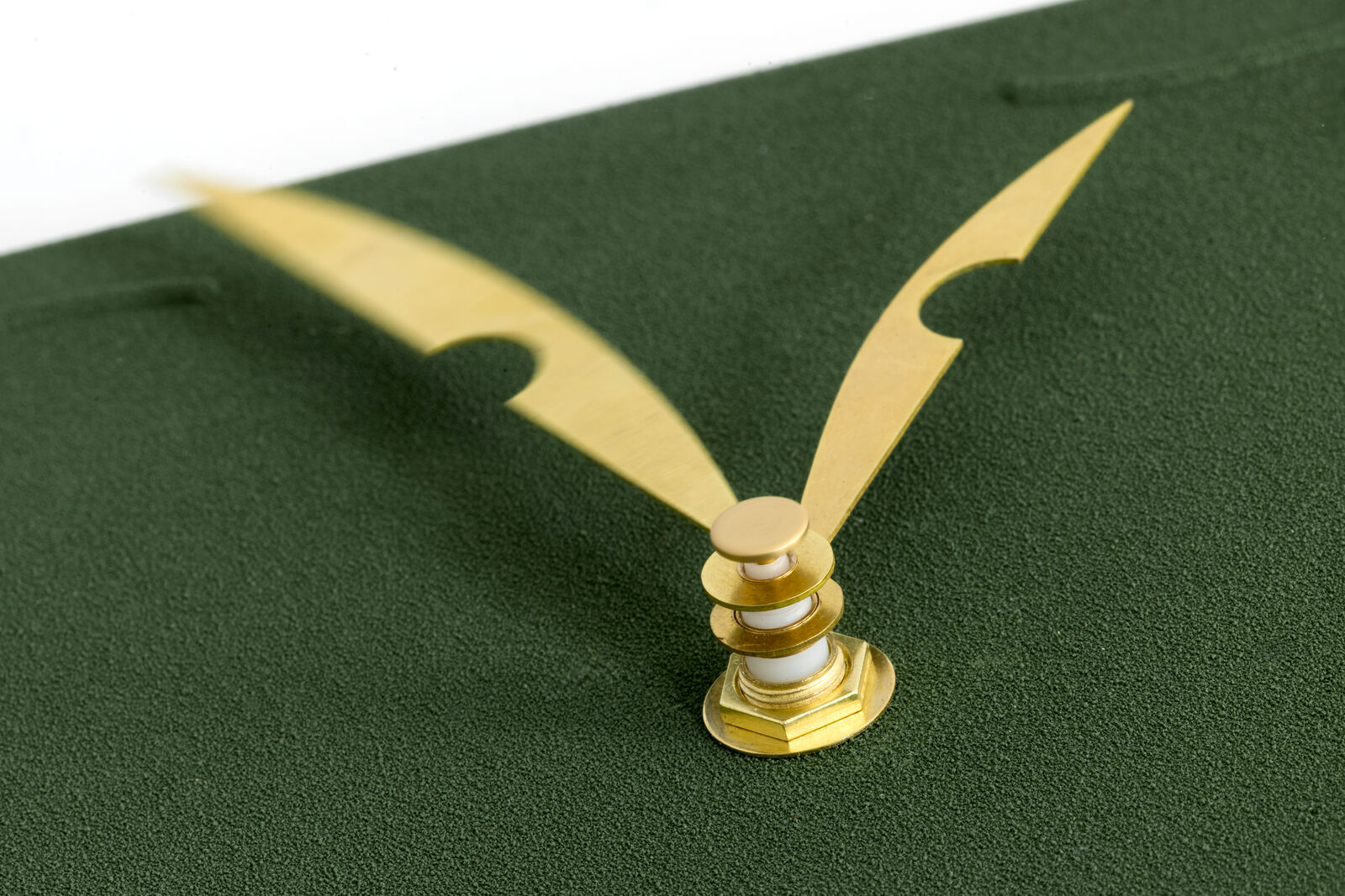 Op deze groene keramische klok met zestien cijfers glipt het 24-uurssysteem, dat vaak wordt gebruikt voor digitale klokken, in het analoge 12-uur systeem: het cijfer ‘16’ is geplaatst op de positie van de 4 uur.